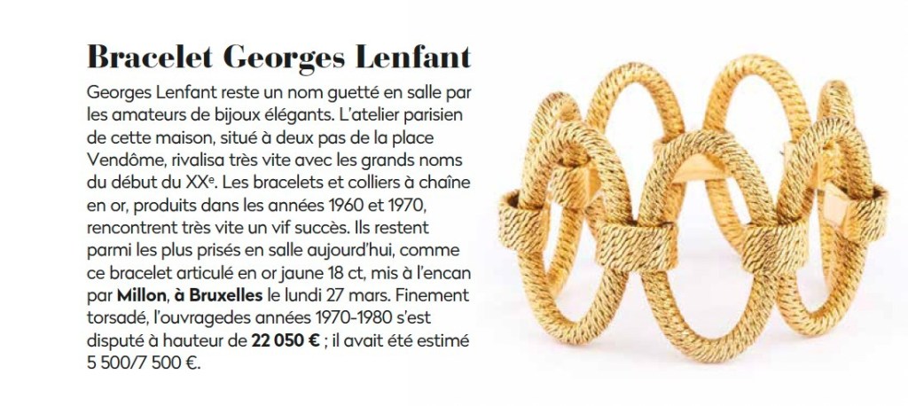 Lorsque l’on évalue un bijou dans l’idée de le présenter aux enchères, on regarde bien entendu la qualité des matières, la taille du bijou, s’il est dégradé ou non mais ce qui apporte une plus-value réelle c’est une attribution à une grande maison ou à un orfèvre reconnu. Dans le cas de ce bracelet, le prix de l’or a bien entendu été le premier facteur d’évaluation mais il y avait aussi un poinçon partiel et un art joaillier qui s’approchaient à la perfection du travail de Georges Lenfant. Pour permettre un départ d’enchères très attractif, ce bracelet a été mis aux enchères avec une estimation de 5500/7500 euro dépassant déjà le prix de l’or. Ce travail, avec la Maison de Ventes aux Enchères Millon Belgique et la publicité réalisée autour de ce bijou et de sa signature, a porté ses fruits. La bataille entre acheteurs a été rude et s’est arrêtée à 22050 euro frais compris (soit 17000 euro prix marteau). La Gazette de Drouot a d’ailleurs sorti un article en avril 2023 pour souligner ce prix de vente remarquable !